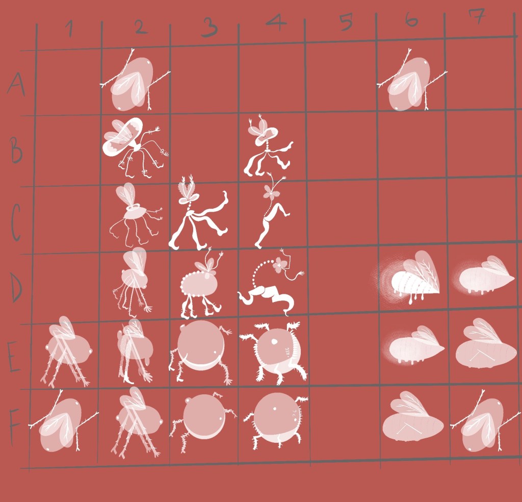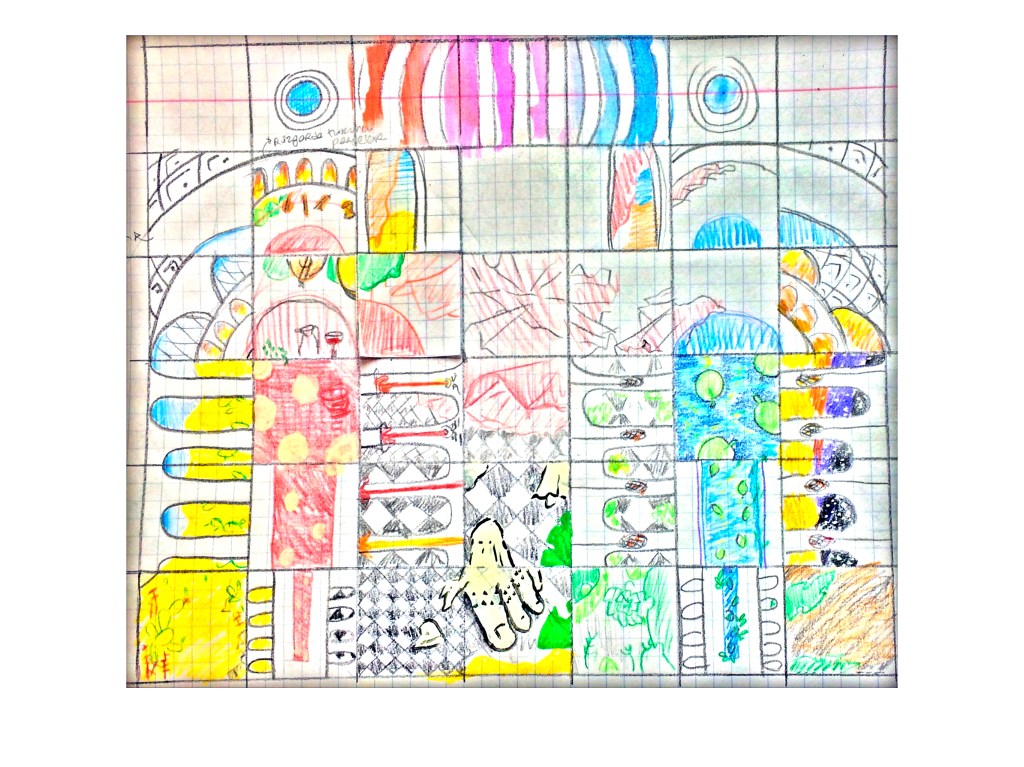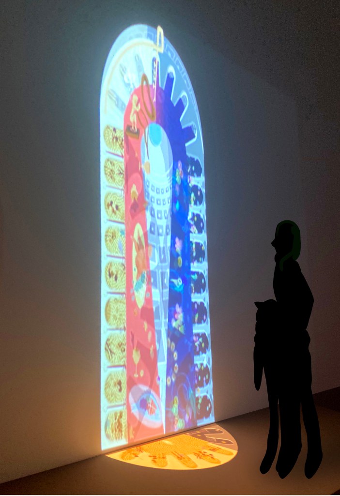 The animation is a 150*350 cm wall panel where each section visualizes a different fragment of the environment. Although the animated image has six general areas, while roaming their gaze amongst it, the viewer realizes that the rooms don’t have borders. They juxtapose with each other. On the very bottom, projected on the ground, is the desert, where the Devils seemingly enter the palace, the rest of the palace is projected on a wall where the viewer is advised to step back and look up in order to see the full composition.